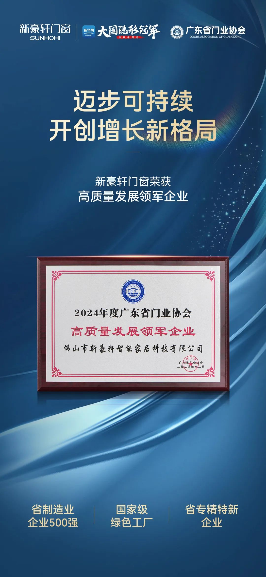 会上,新豪轩门窗荣获“高质量发展领军企业”,新豪轩集团董事长冯文波先生荣获“2024年度行业领军人物”、总裁冯佐星先生荣获“2024年度行业青年领袖”。值此家居行业深度洗牌期,我们相信,唯有坚定高质量发展,方能行稳致远,成就长期主义事业!