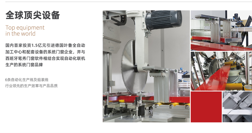 国内首家投资1.5亿元引进德国叶鲁全自动加工中心和配套设备的系统门窗企业,并与西班牙笔秀门窗软件相结合实现自动化联机生产的系统门窗品牌