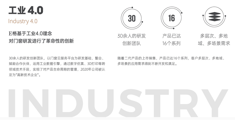 E格基于工业4.0理念对门窗研发进行了革命性的创新30余人的研发创新团队,以门窗云服务平台为研发基础,整合、赋能合作伙伴,运用工业数据引擎,通过数字仿真、3D打印等跨领域技术手段,实现了对产品生命周期的管理,2020年公司被认定为”高新技术企业"。随着二代产品的上市销售,产品已达16个系列,客户多层次、多地域、多场景的应用需求得到不断开发和满足。