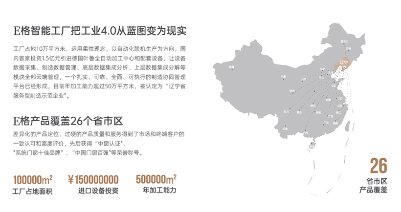 E格品牌创立于2015年是国内首家采用互联网+工业4.0理念研发、生产的高端系统门窗的品牌;系统门窗十佳品牌|中国门窗百强|CWCTS中窗认证系统门窗|建筑系统门窗技术准则参编单位|建筑系统门窗安装技术准则参编单位|国家高新技术企业|辽宁省工业和信息化委员会认证服务型制造示范企业|辽宁省工业和信息化委员会认证专精特新产品|德国叶鲁亚太地区唯一定点考察单位|数十项专利认证|全国200+专卖店|覆盖国内26个省市区。